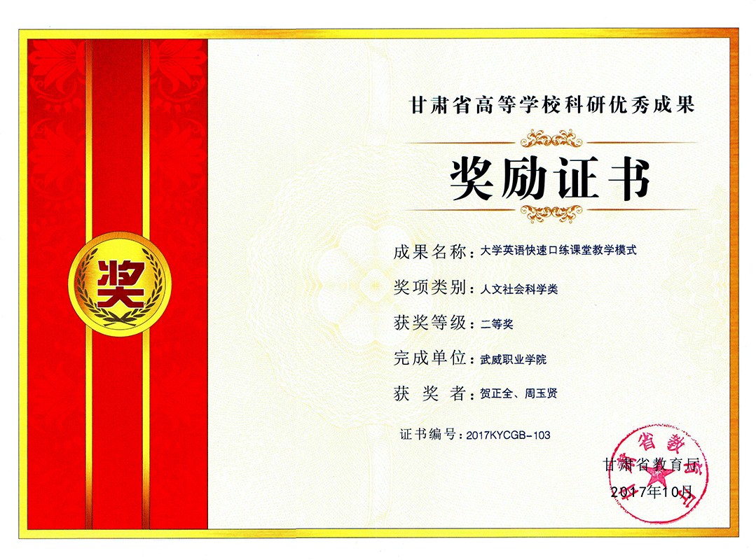 近日从学院科研处传来喜讯,我系教师贺正全申报的《大学英语快速口练课堂教学模式》荣获甘肃省教育厅颁发的2017年甘肃省高等学校科研优秀成果二等奖。这是我院自建院以来获得的最高级别的高校科研优秀成果奖。本次获得二等奖的科研成果共有154项,其中高职高专报送的科研成果只有9项获得二等奖。
